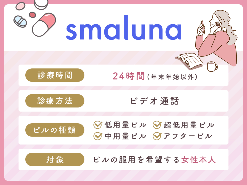 スマルナは、低用量ピル・超低用量ピル・中用量ピル・アフターピルの取り扱いをしているオンライン診療サービスです。